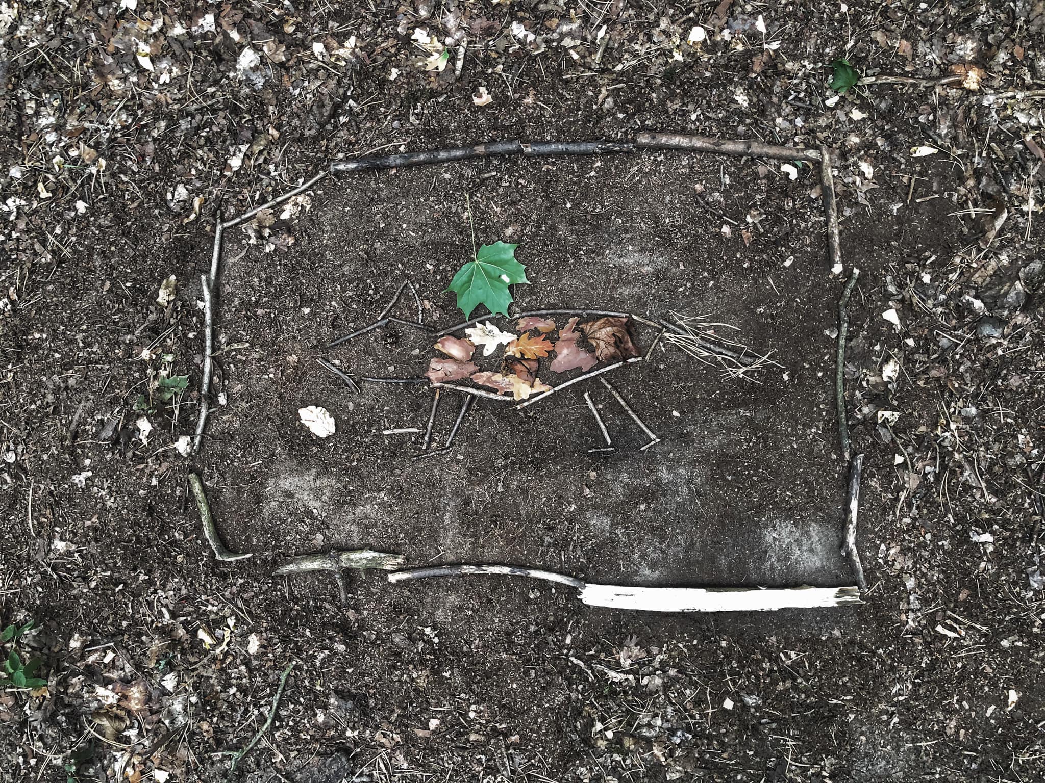 Eine Schulklasse war ab und zu unterwegs. Sie stellten auf dem Boden kleine Bilder zusammen. Mit Rahmen und mit Materialen, die sich auf dem Boden so finden.